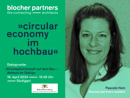 Im Auftrag des Umweltministeriums Baden-Württemberg lädt das Institut für Energie- und Umweltforschung Heidelberg (ifeu) zusammen mit der Architektenkammer Baden-Württemberg am 16. April zum Fachsymposium »Circular Economy im Hochbau – Gemeinsam kreislaufgerecht Bauen und Gestalten« nach Stuttgart ein. Als Teil der Dialogrunde am Nachmittag wird Pascale Hein, Geschäftsführerin blocher partners sustain, mit weiteren Planenden, Bauherren und Akteuren aus der Bauausführung reflektieren, wie die vielen guten Ansätze und Lösungen schneller und umfassender in die Baupraxis überführt werden können.
